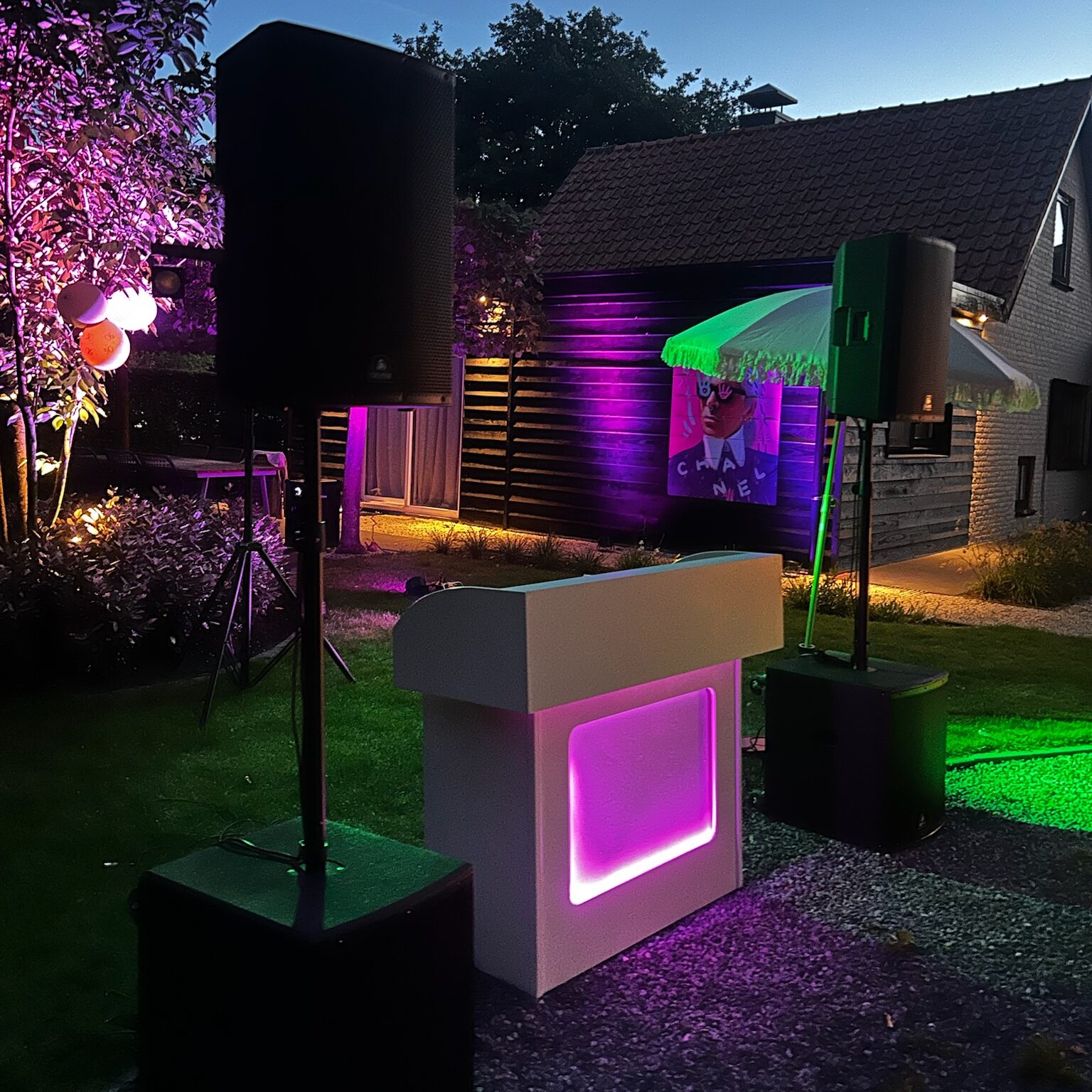 Geef de locatie direct meer sfeer. Met uplights stemmen we kleur en uitstraling af op jullie feest of thema.